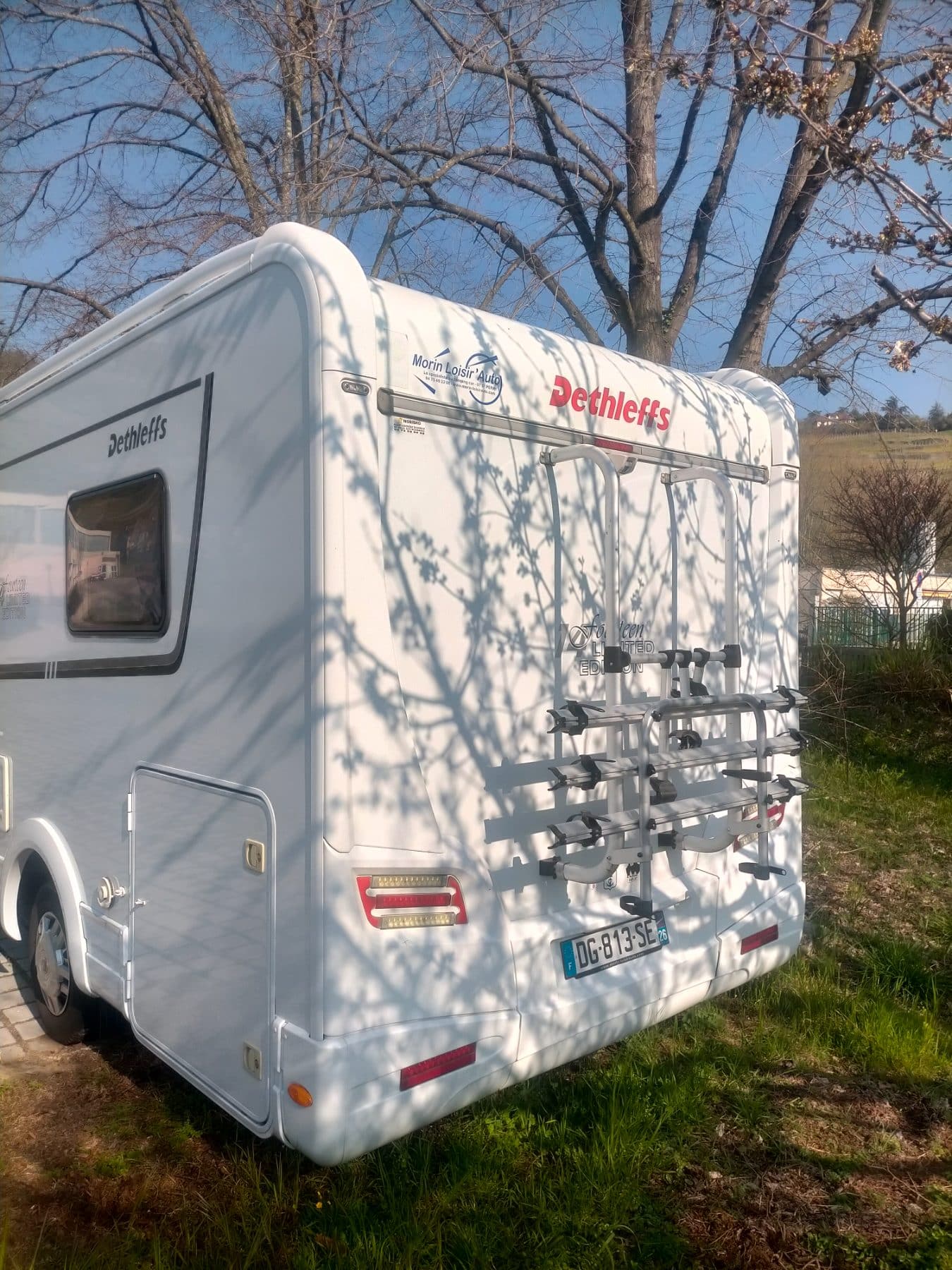 Arrière de camping-car blanc avec porte-vélos