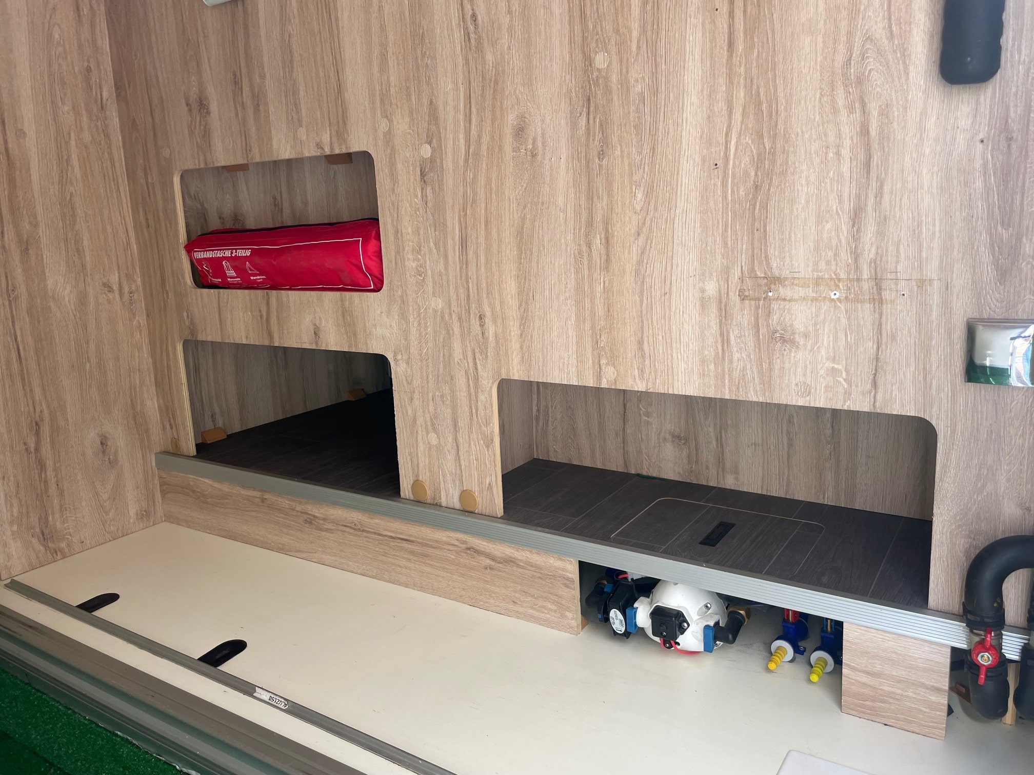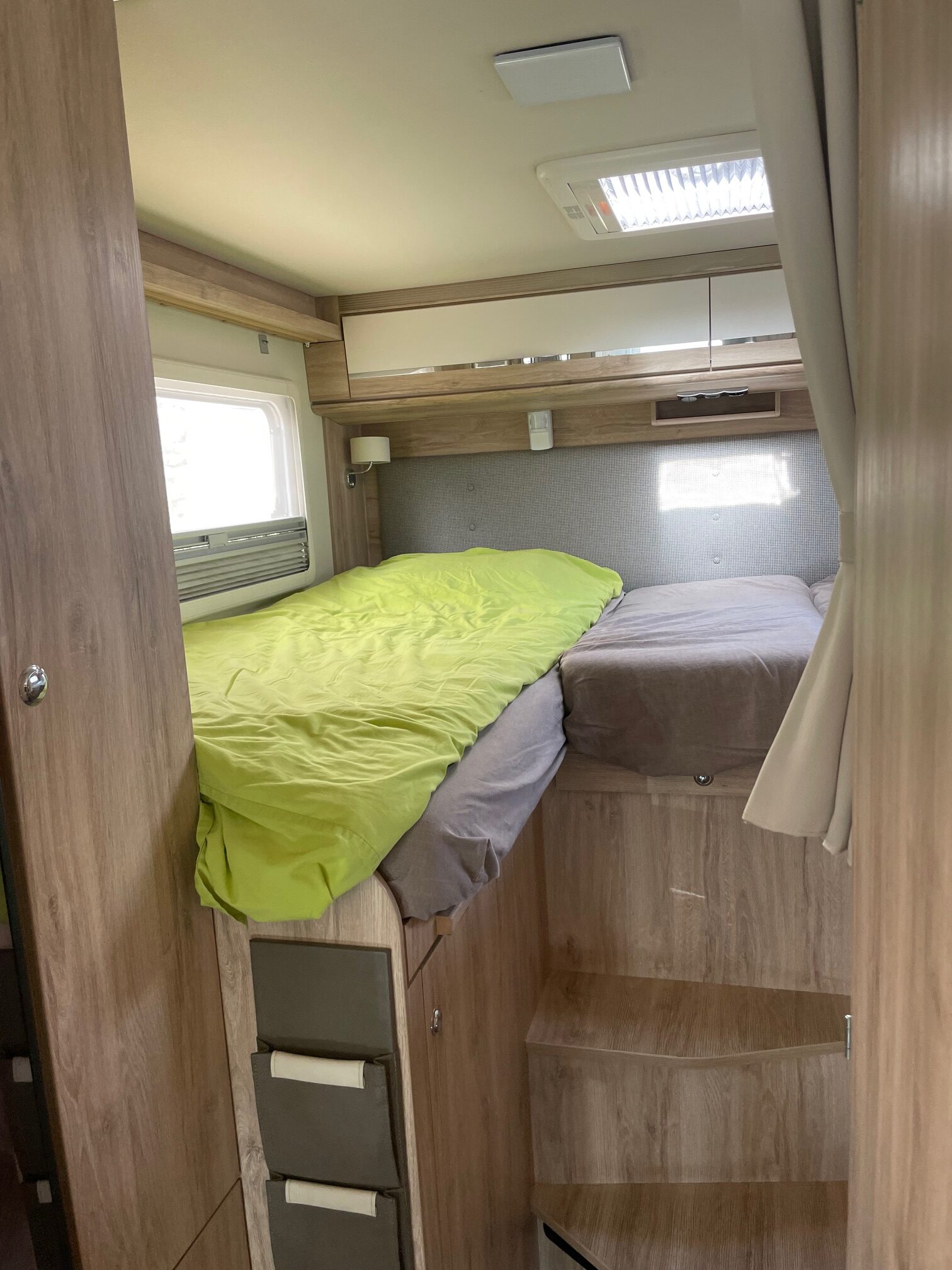 Sous les lits il y a une armoire et un grand garage. Un autre armoire est en face du lit .