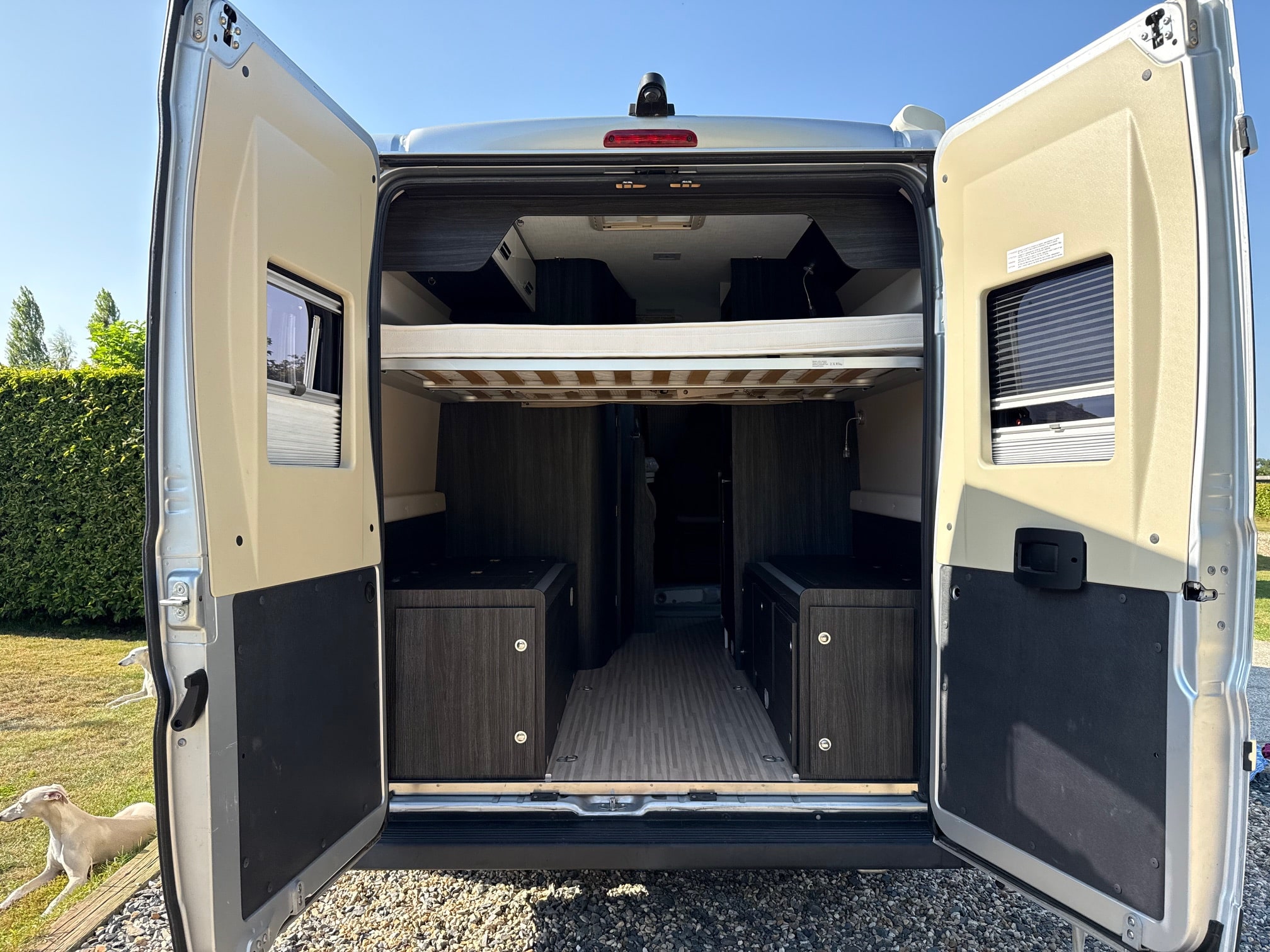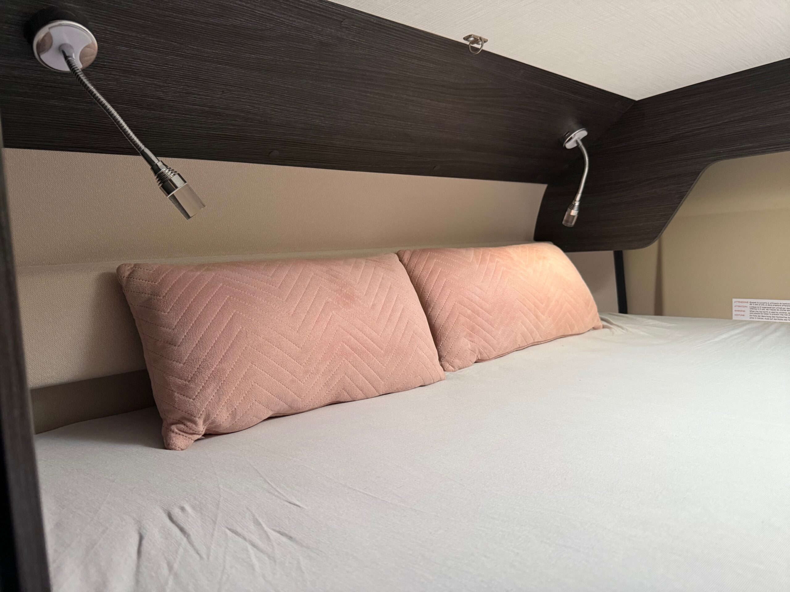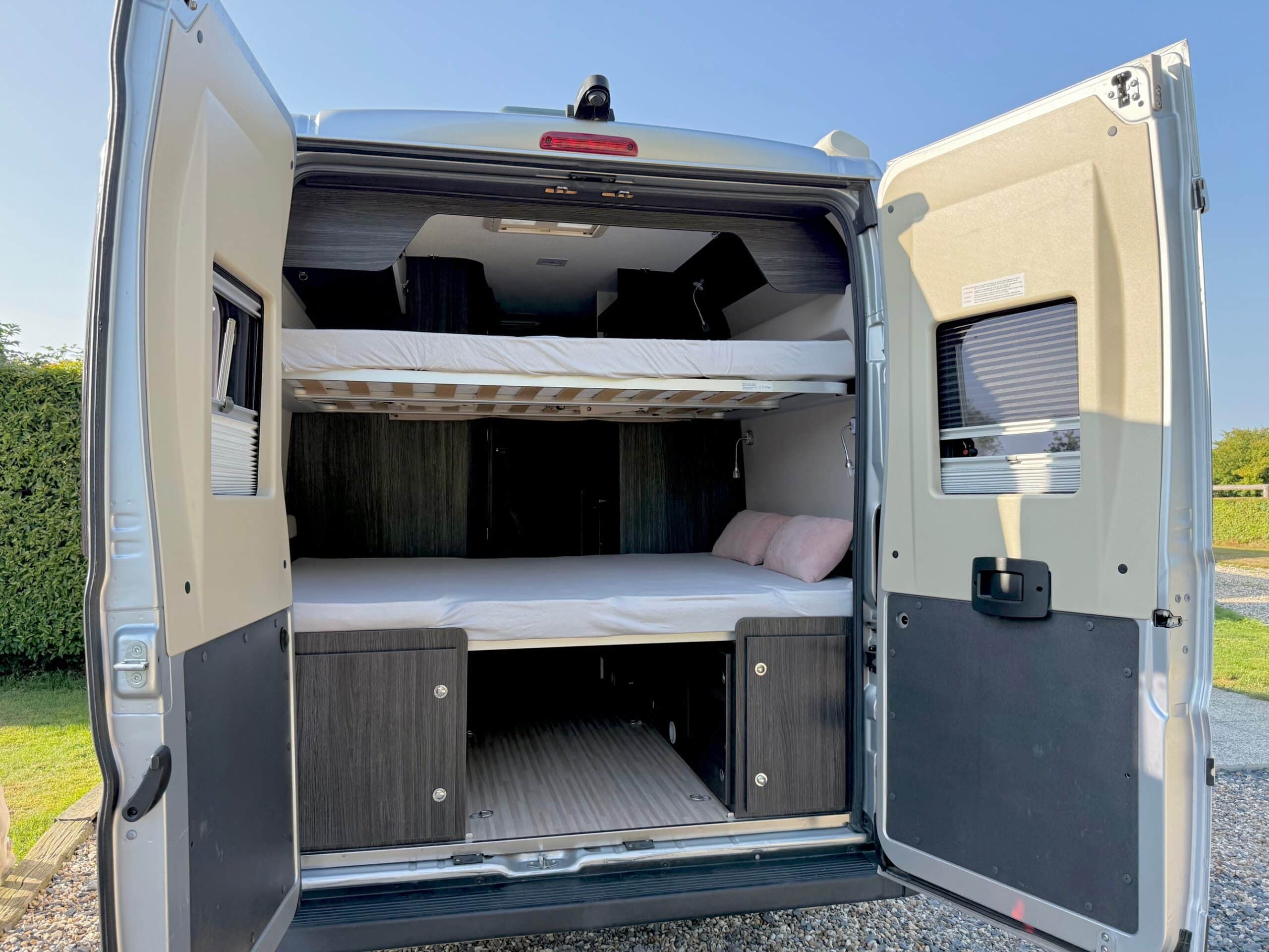 Pour la nuit : 2 lits transverses 2 places superposés, soit 4 couchages + 1 couchage d’appoint ou enfant à l’avant