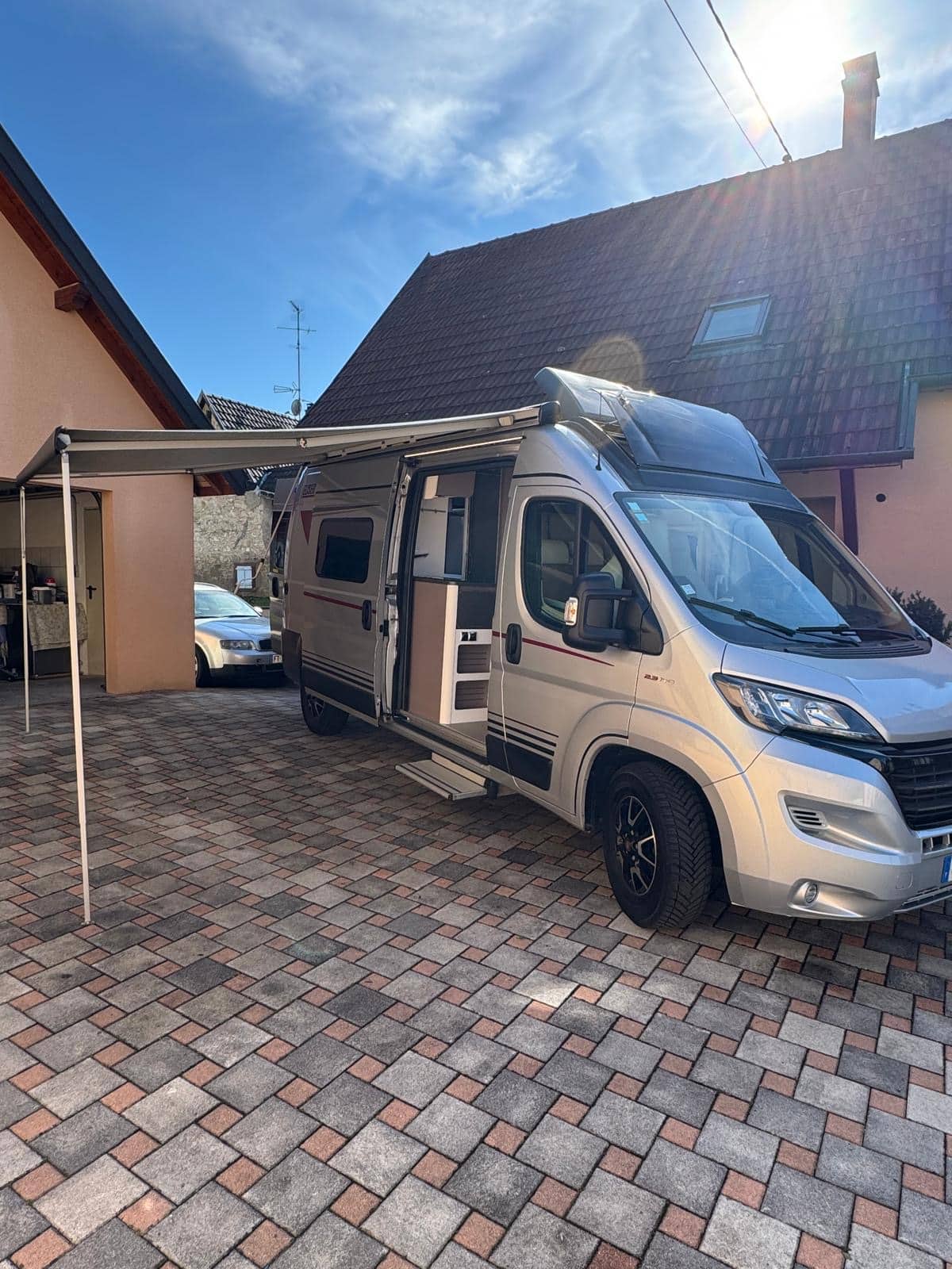 Camping-car blanc avec auvent déployé dans cour pavée