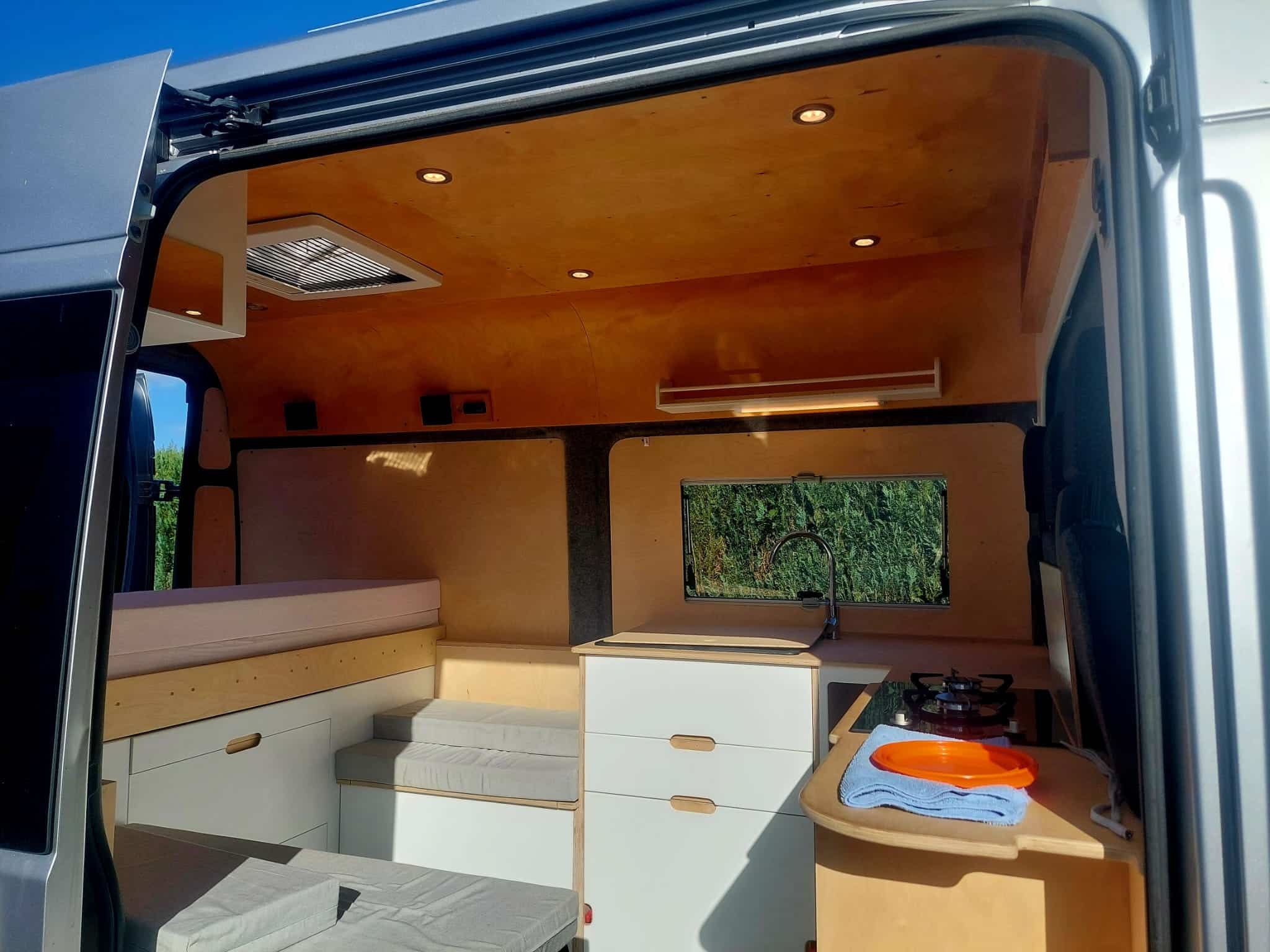 Cuisine équipée : Grand évier (40cm), 2 feux gaz, et frigo Dometic CFX3 35 (le top du froid en van).