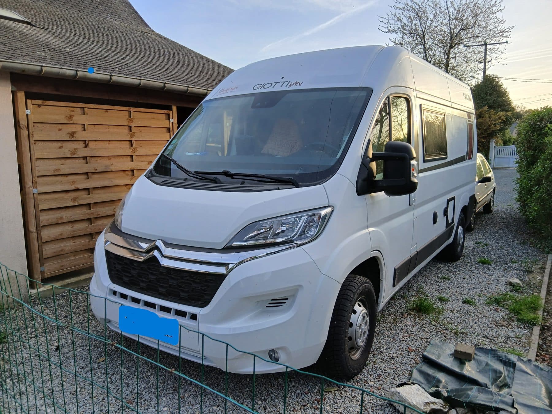 Camping-car blanc stationné devant garage en bois