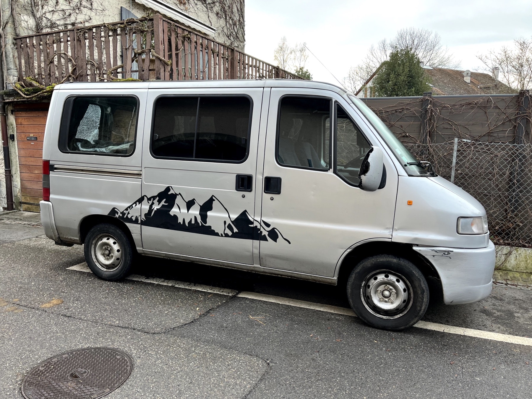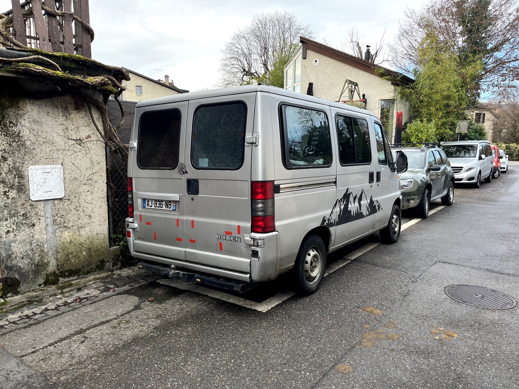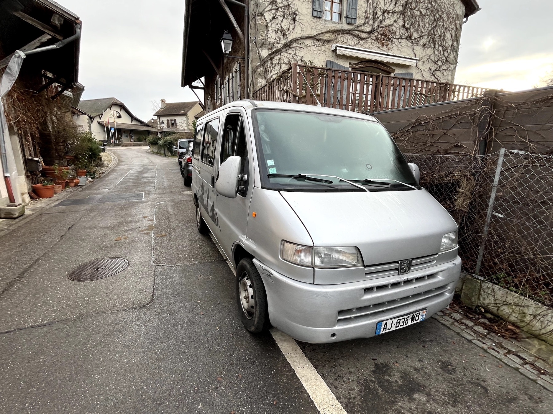 Fourgon argenté stationné dans rue de village