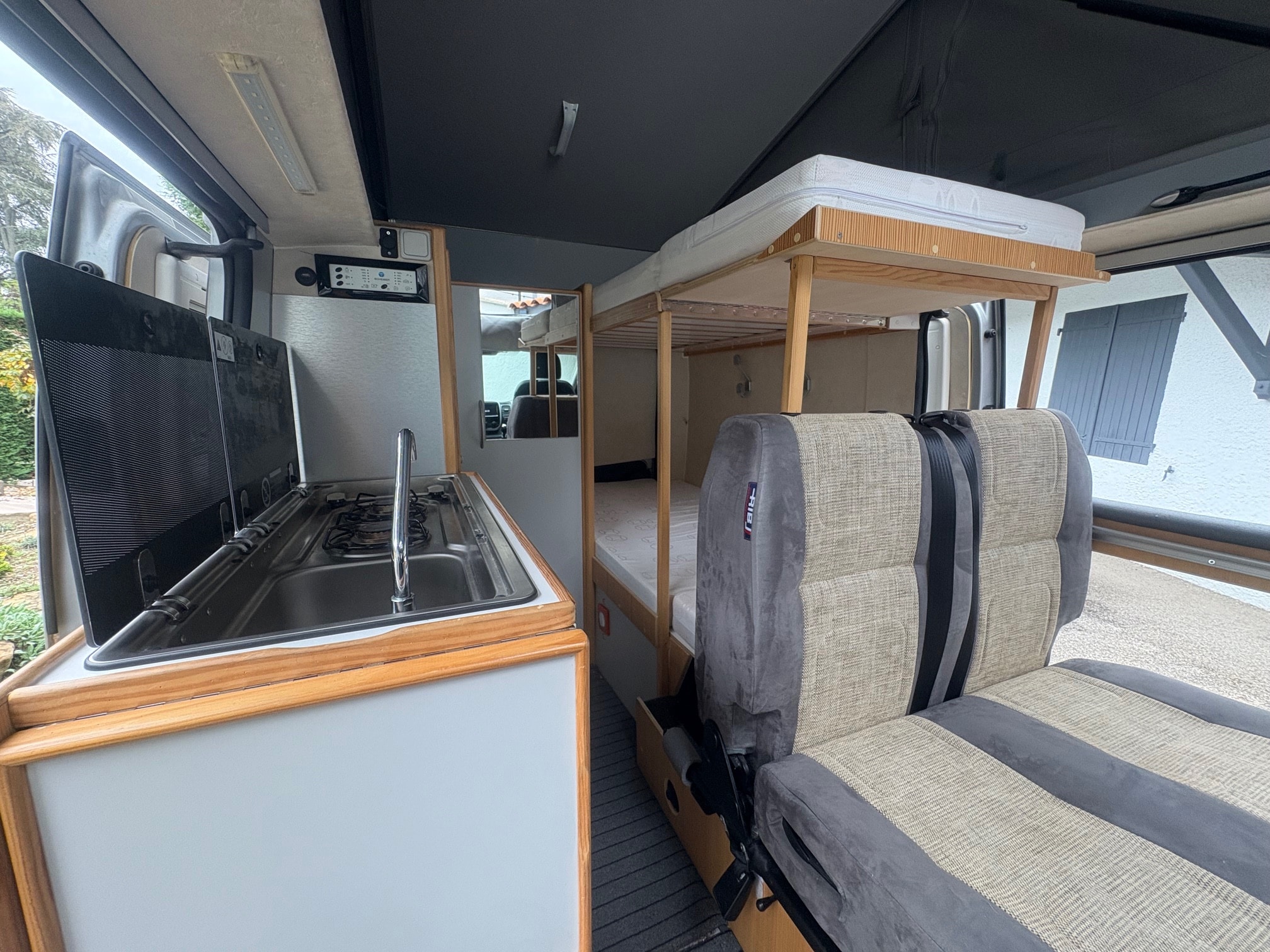 Ce fourgon aménagé est conçu pour accueillir confortablement jusqu'à 4 passagers et offre 3 couchages grâce à un lit escamotable et des lits superposés. Sa configuration astucieuse et ses équipements modernes en font un choix parfait pour les familles ou les aventuriers solitaires.