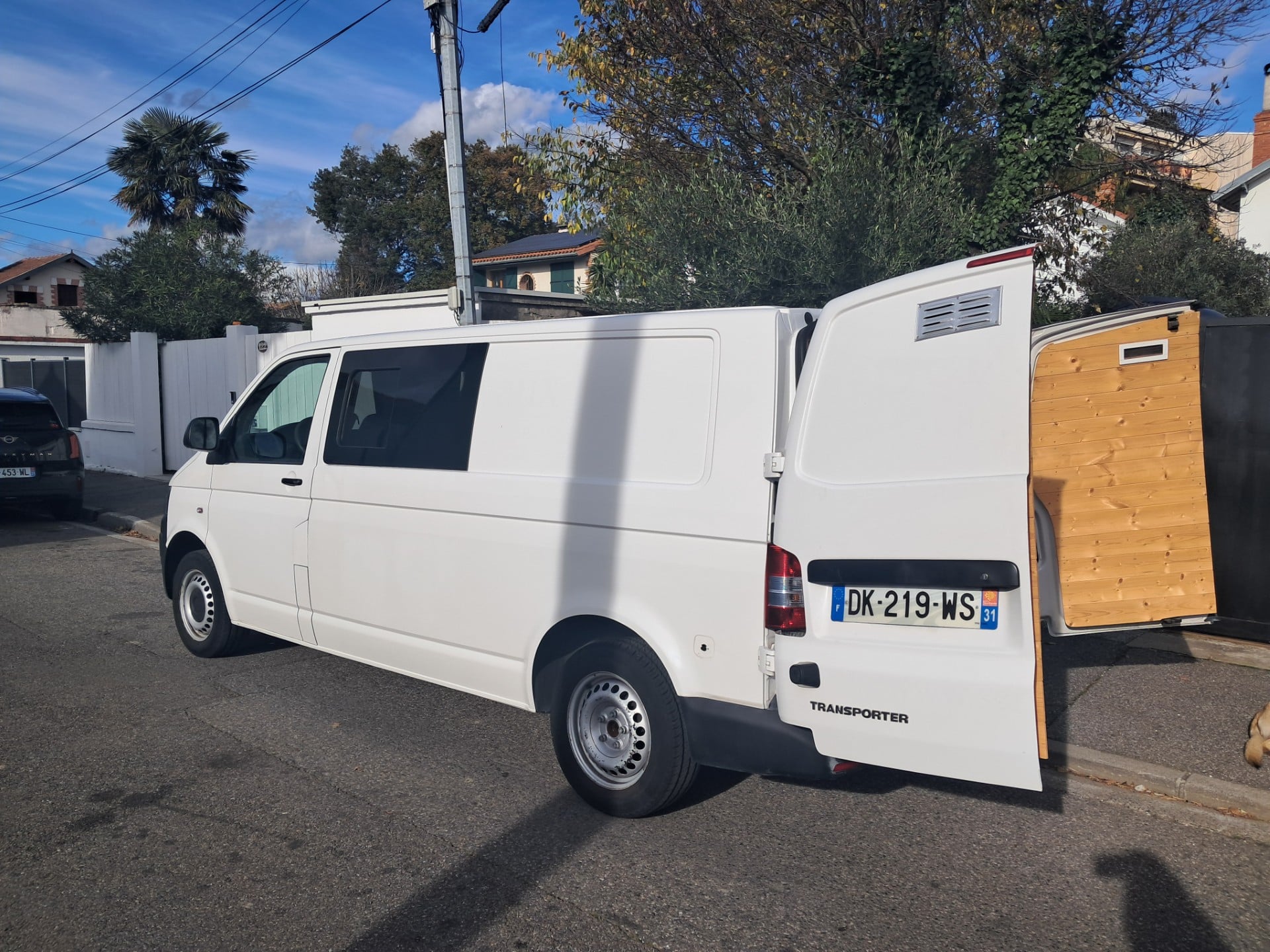 Van Volkswagen T5 long aménagé prêt à voyager.