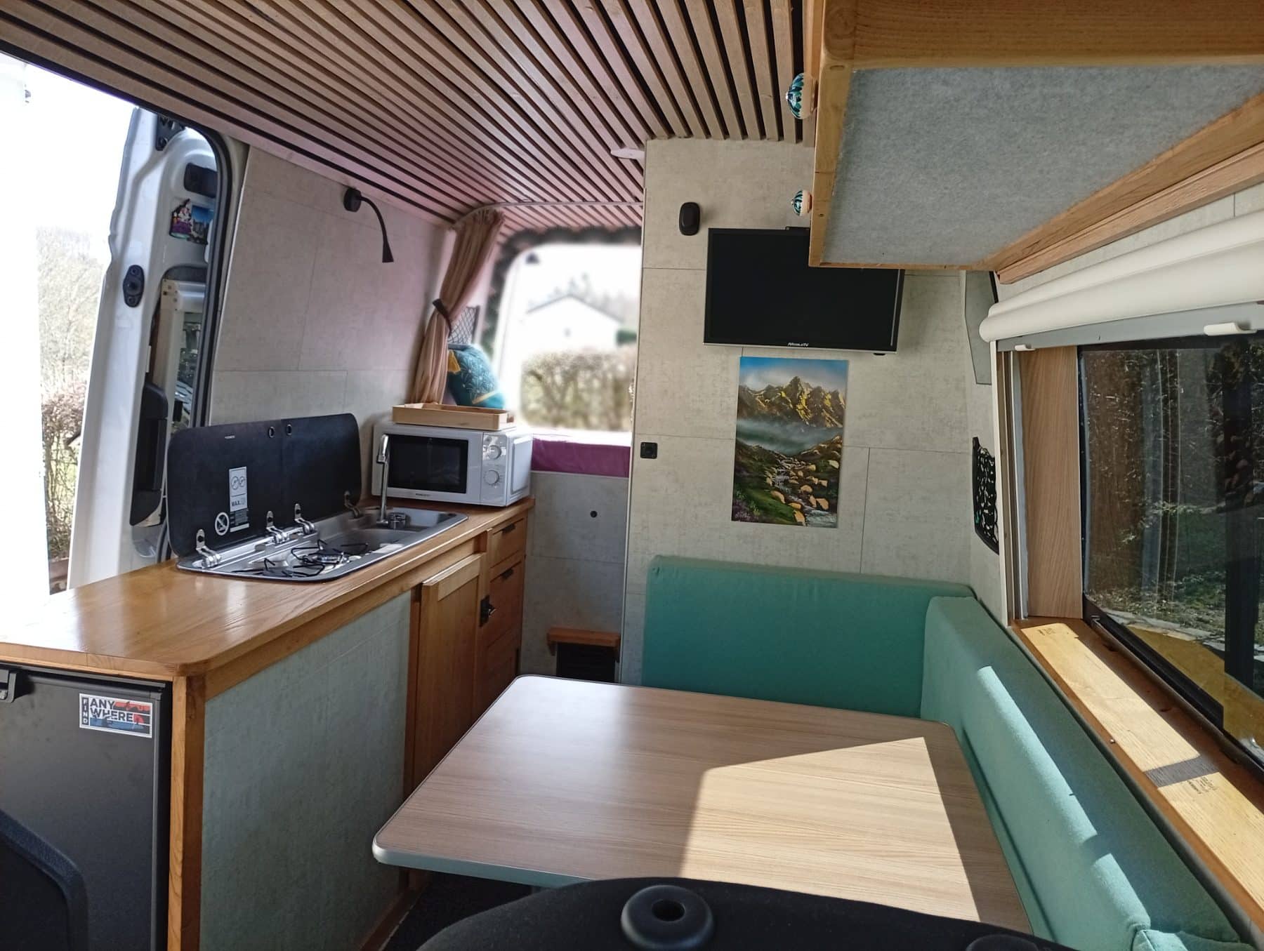 Fourgon aménagé avec un équipement complet idéal pour vos aventures.tres peu servi.auvent 3m.galerie alu avec panneau solaire.batterie auxiliaire.frigo a compression basse conso.webasto chauffage et eau chaude.tv.douche+ lavabo.wc chimique.porte vélo sur attelage.reservoir eau+eau grise 100l.placard avec tiroir de rangement.gps carplay caméra de recul radar de recul.conso 8l .roue de secours.