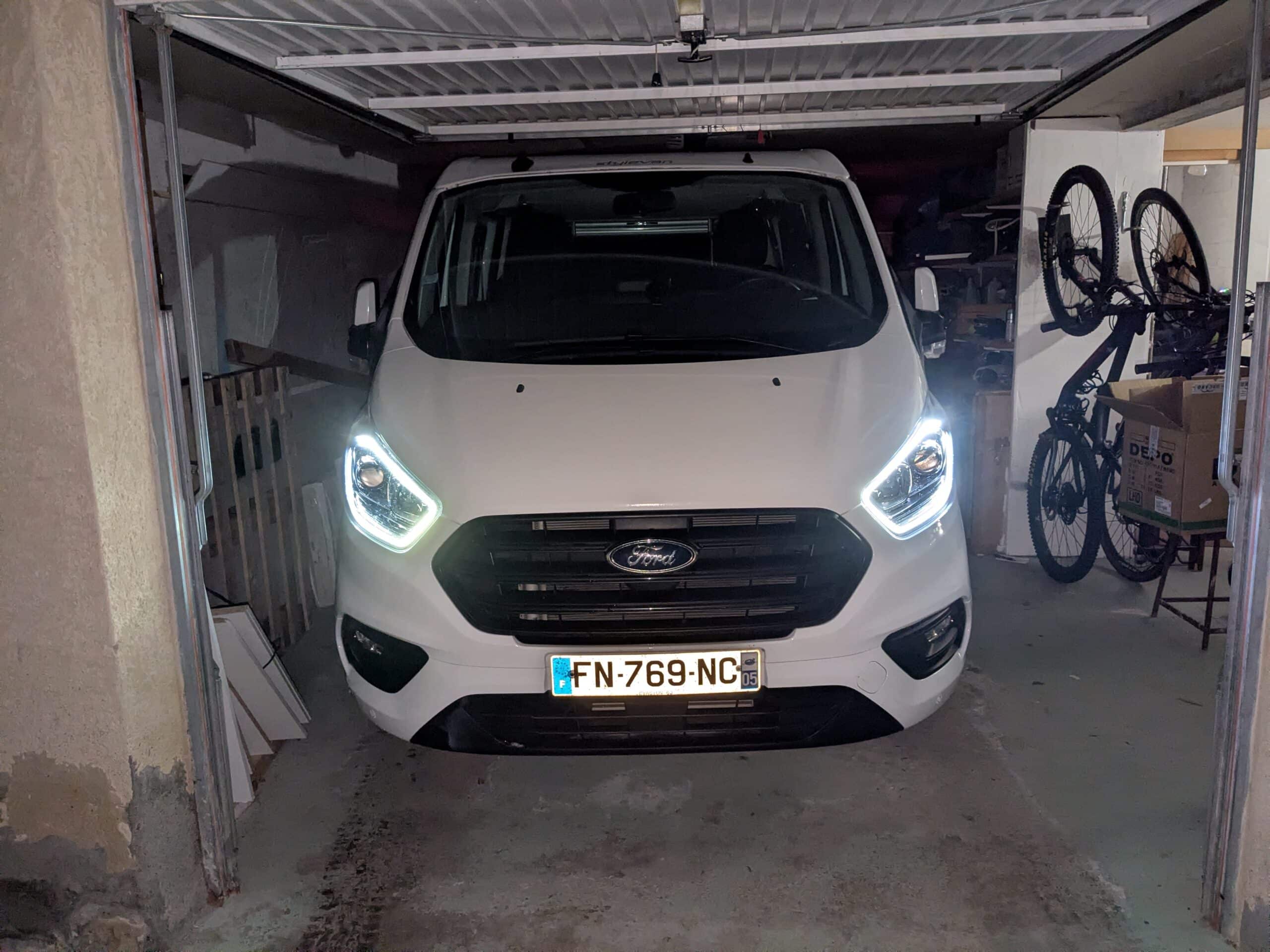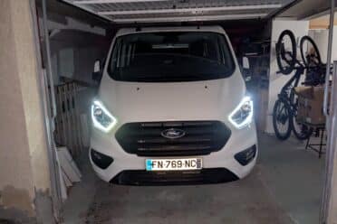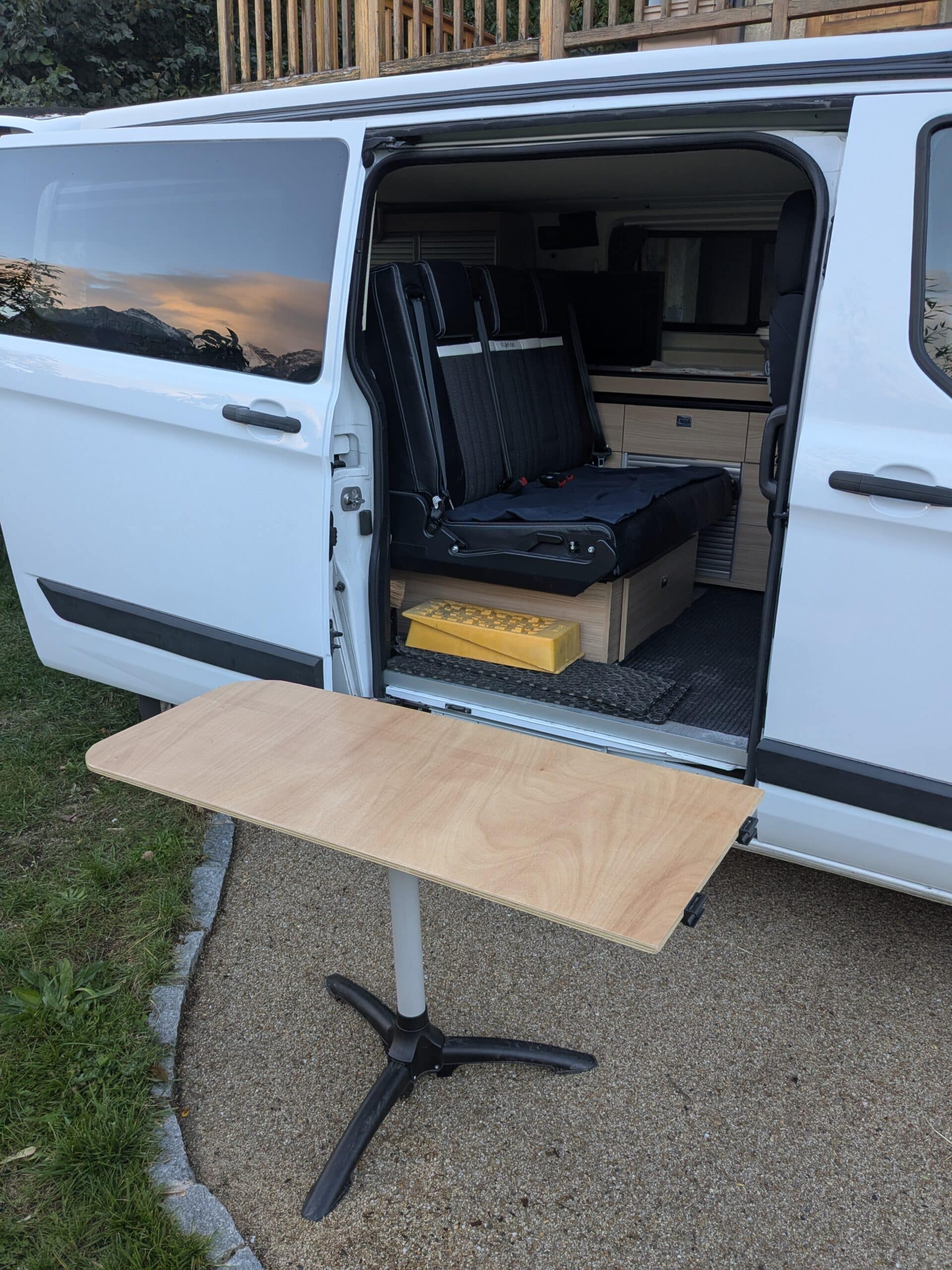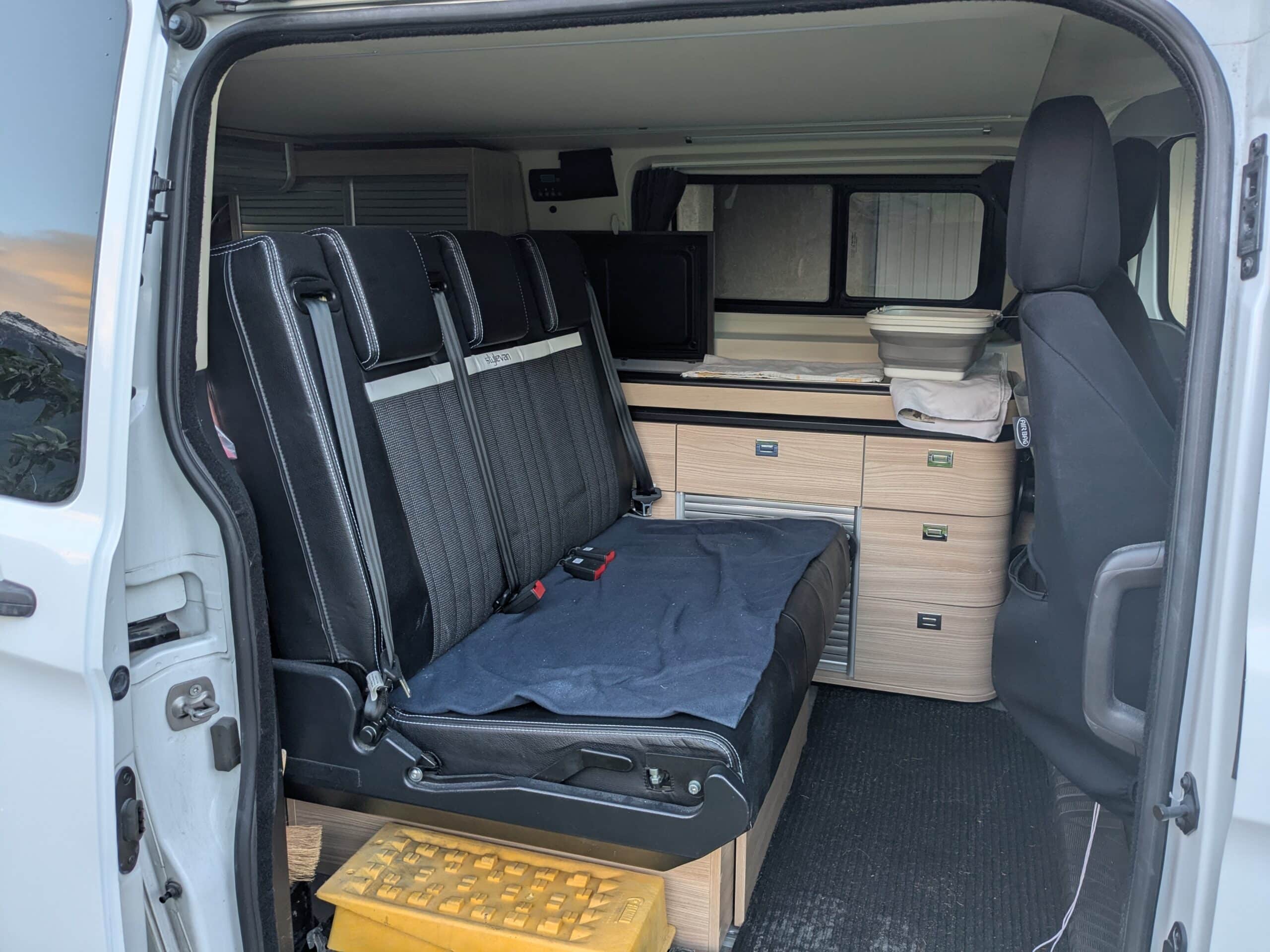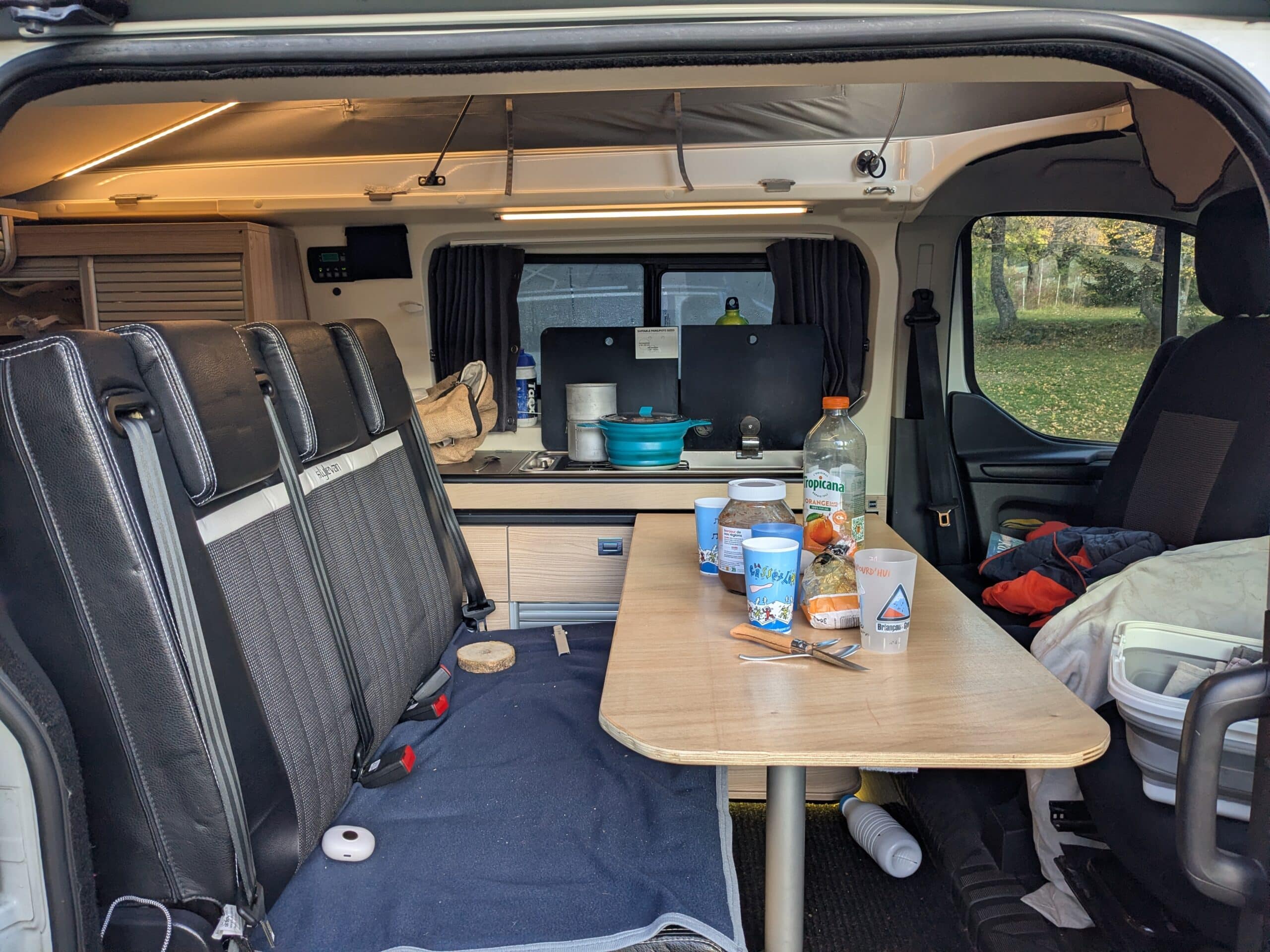 Meuble sur tout le côté gauche comprenant frigo, évier, 2 feux gaz et rangements. Le coffre dispose d'une malle amovible.