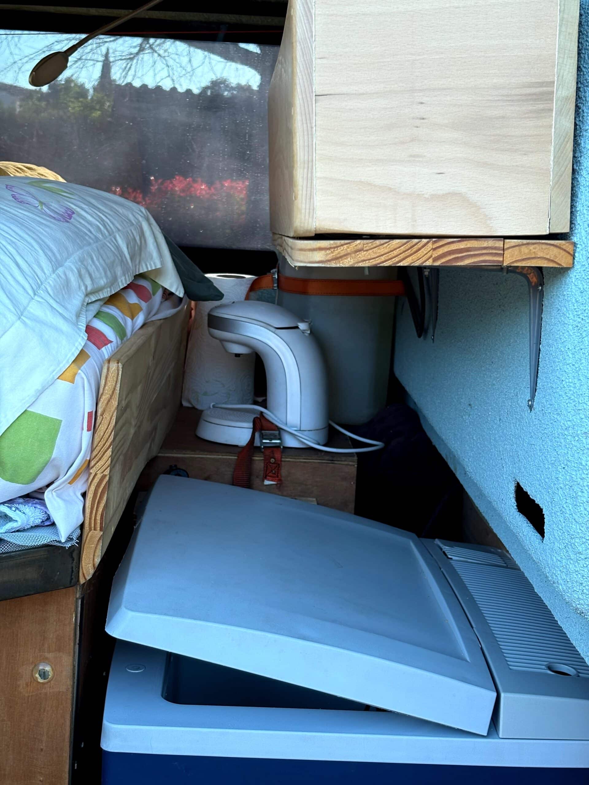 Couchage central avec rangement dessous le lit, frigo a compression, panneau solaires, booster(recharge en roulant) , convertisseur , prise de courant.