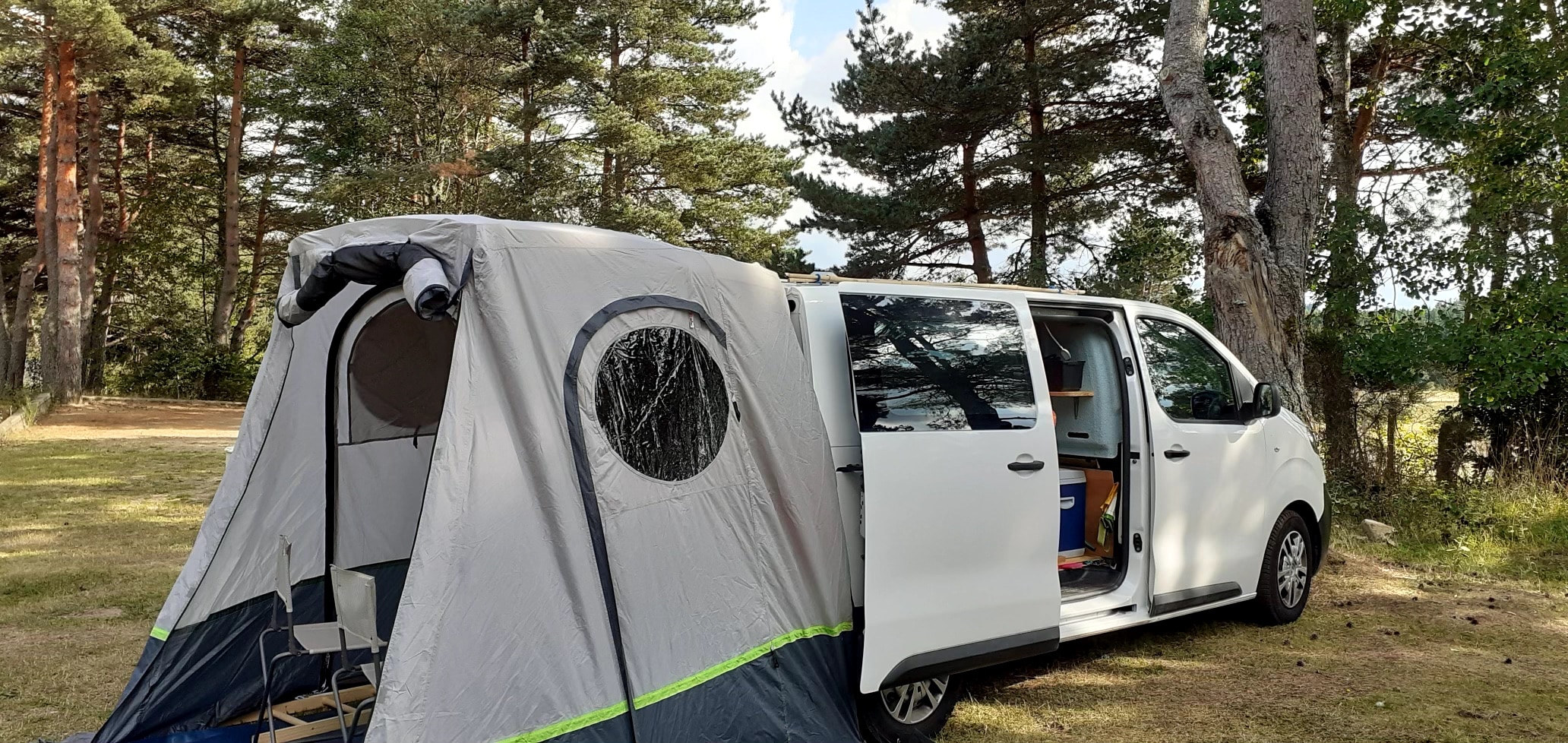 Van aménagé avec tente annexe en forêt