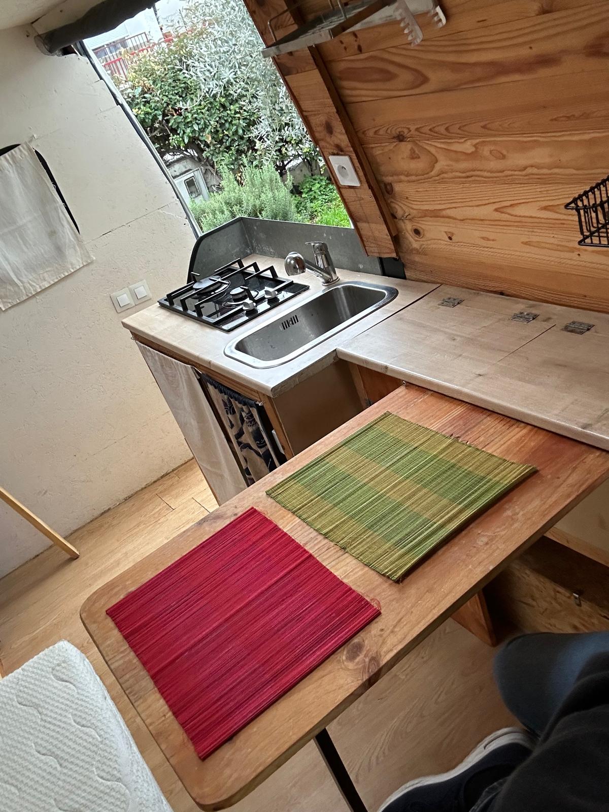 Le van est équipé d'une cuisinière à gaz pour préparer de délicieux repas où que vous soyez. Profitez de la fraîcheur de vos aliments grâce à un frigo intégré. L'installation solaire vous assure une autonomie énergétique, rendant vos voyages encore plus agréables sans souci de recharge fréquente.