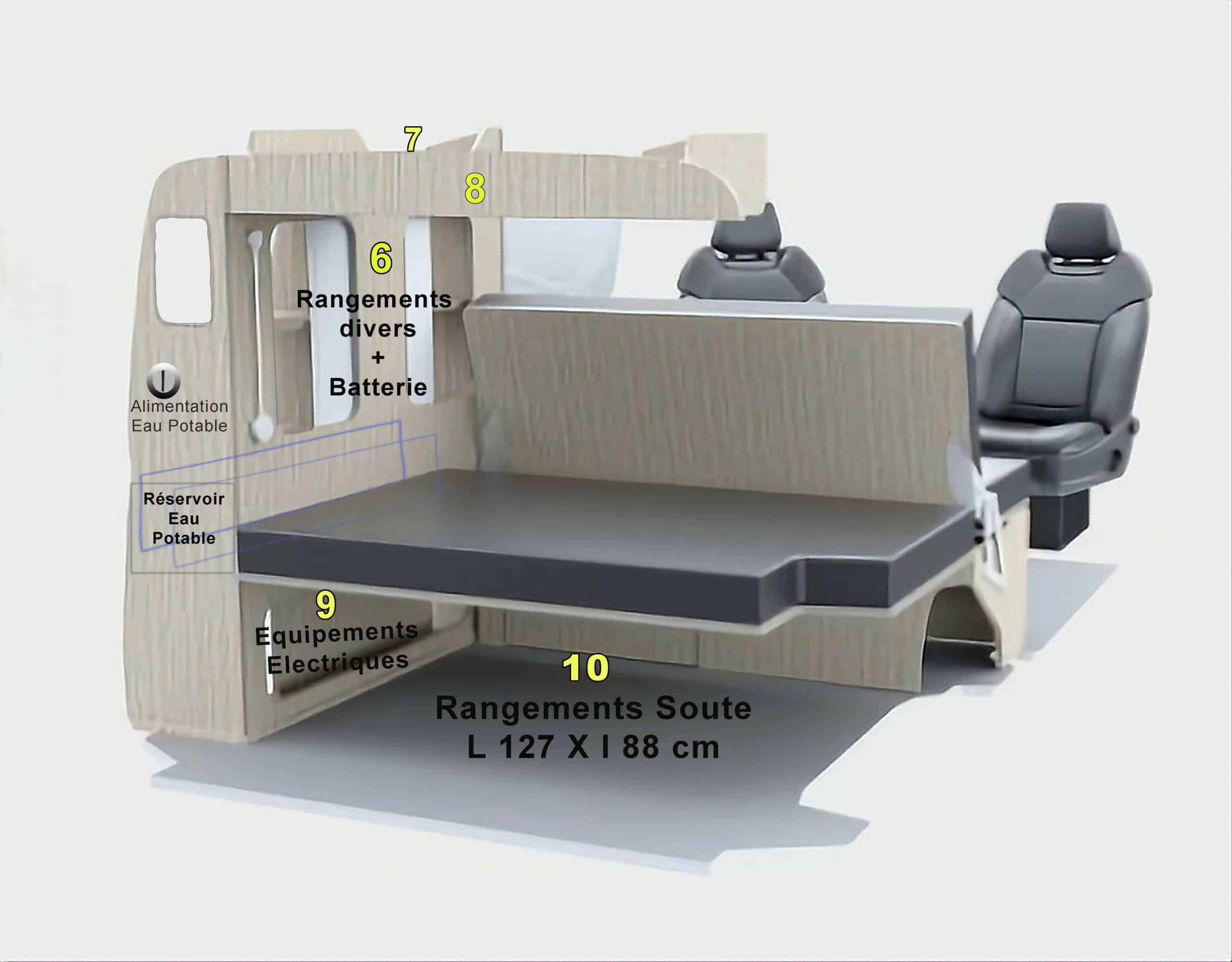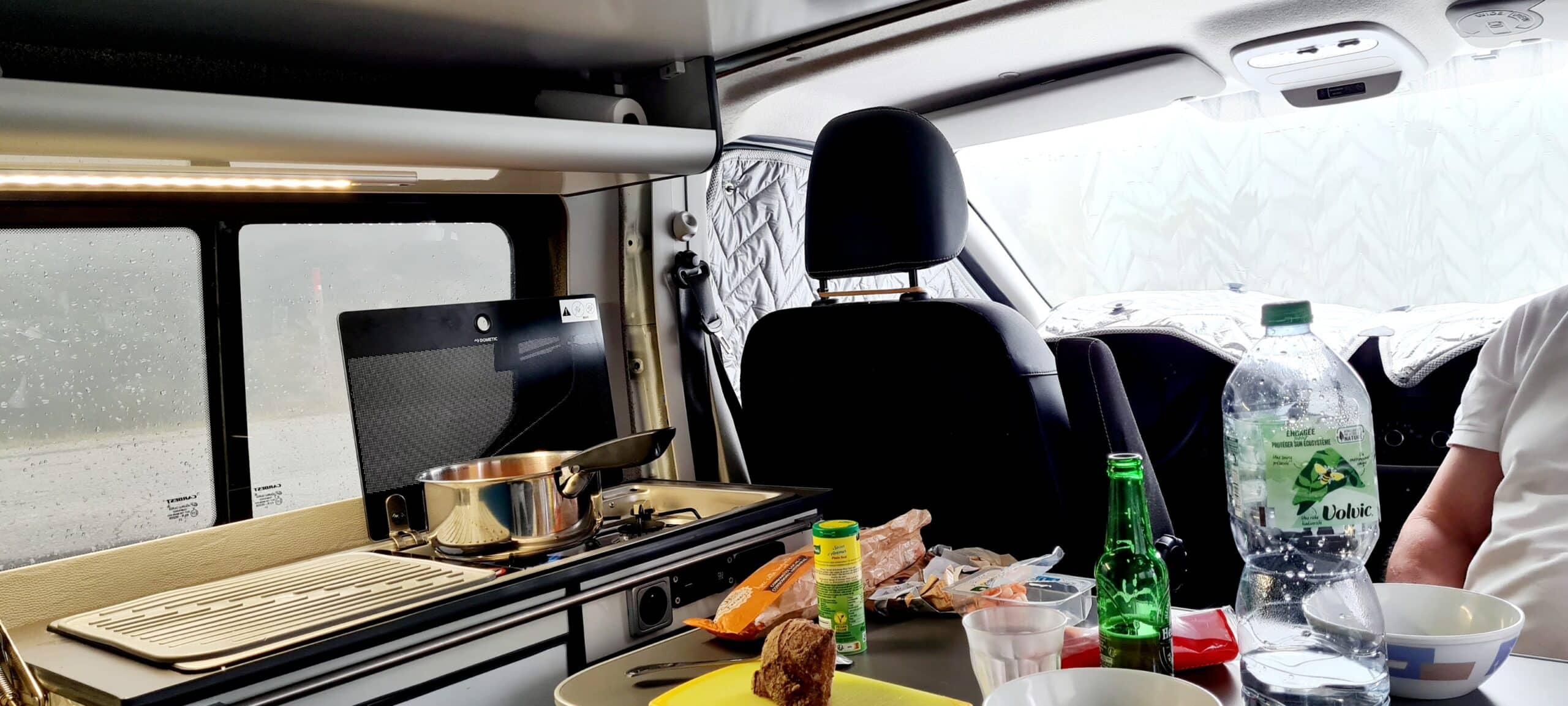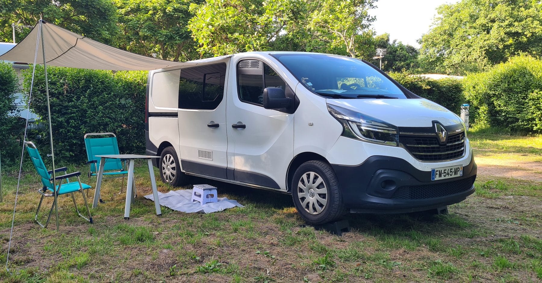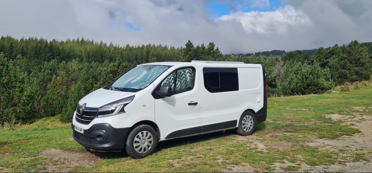 Équipé de rideaux isolants pour pare-brise et fenêtres + douche decathlon avec tapis douche + toilettes pliants...)