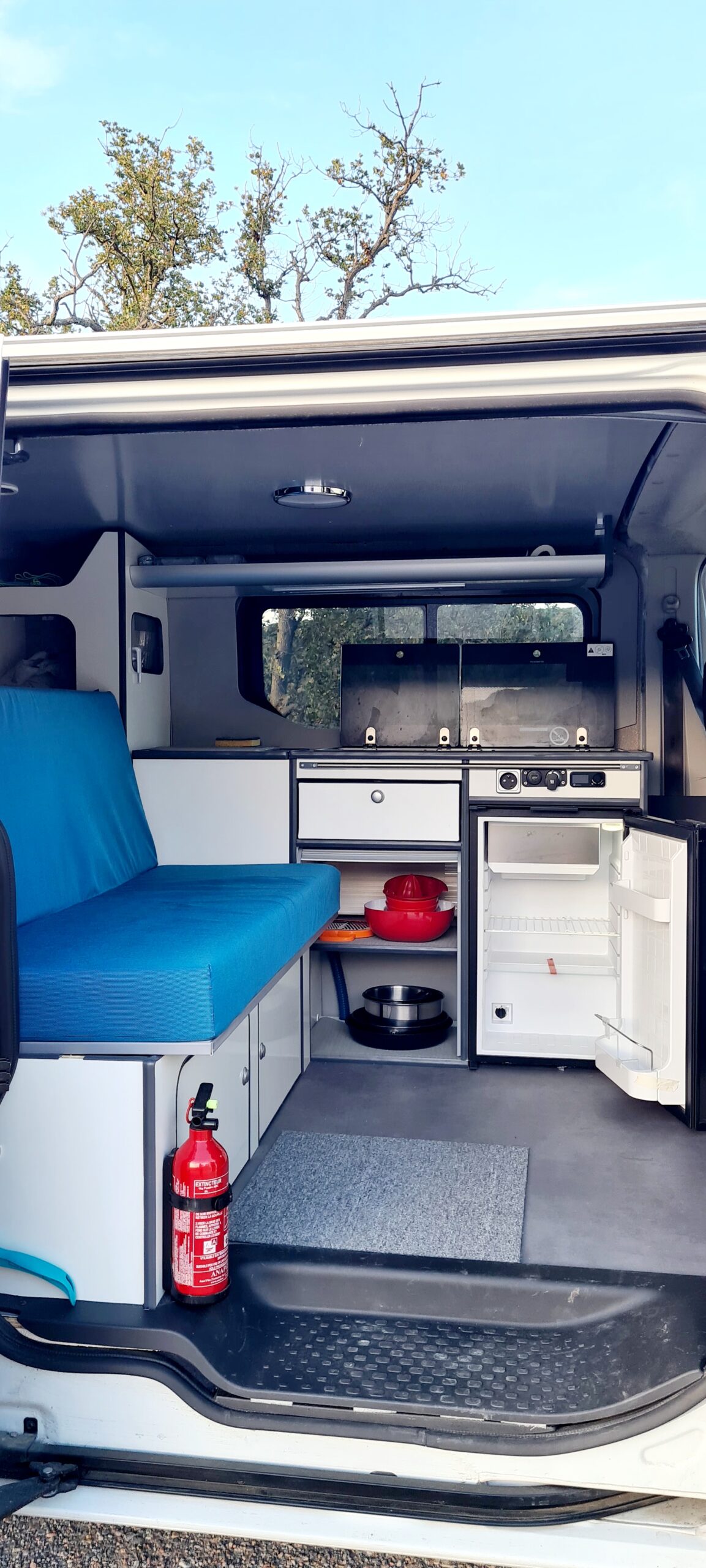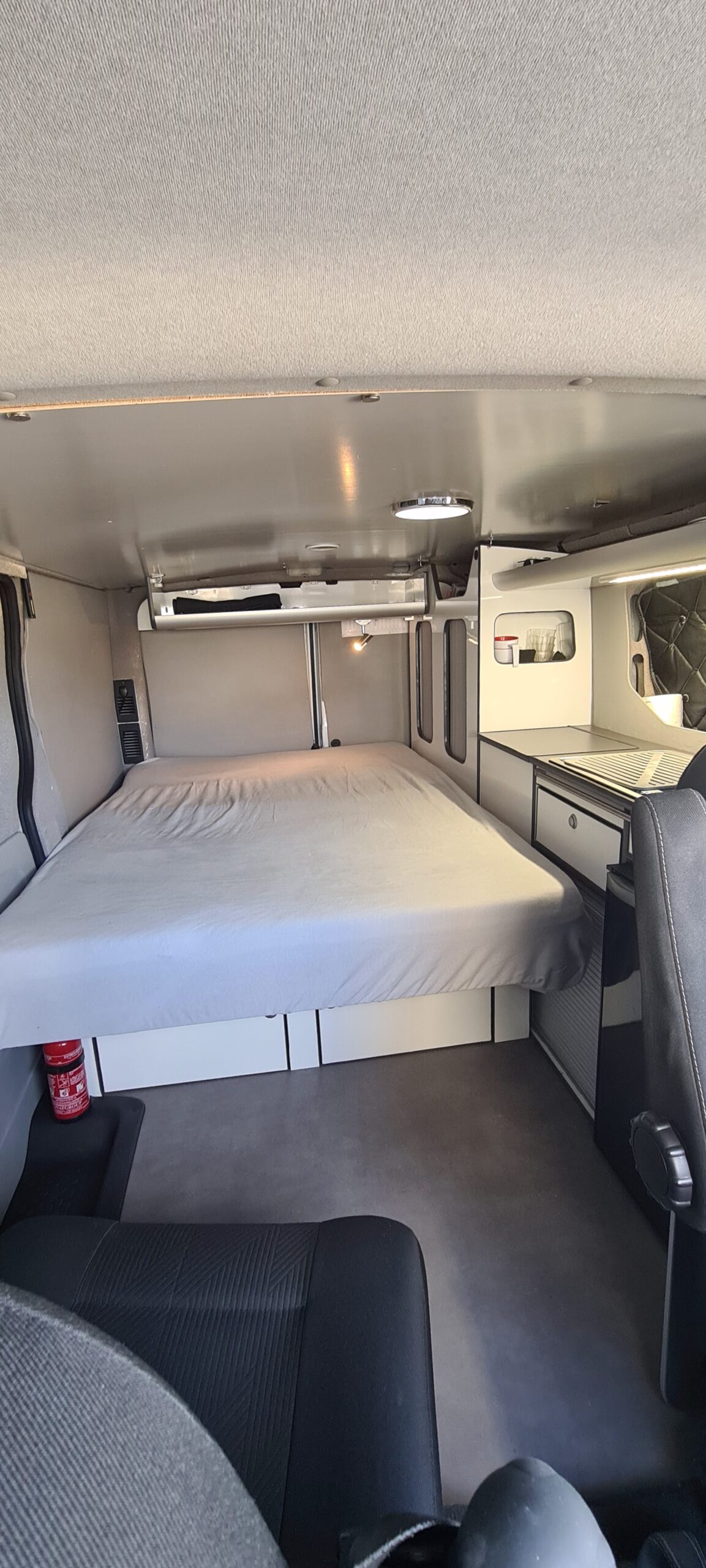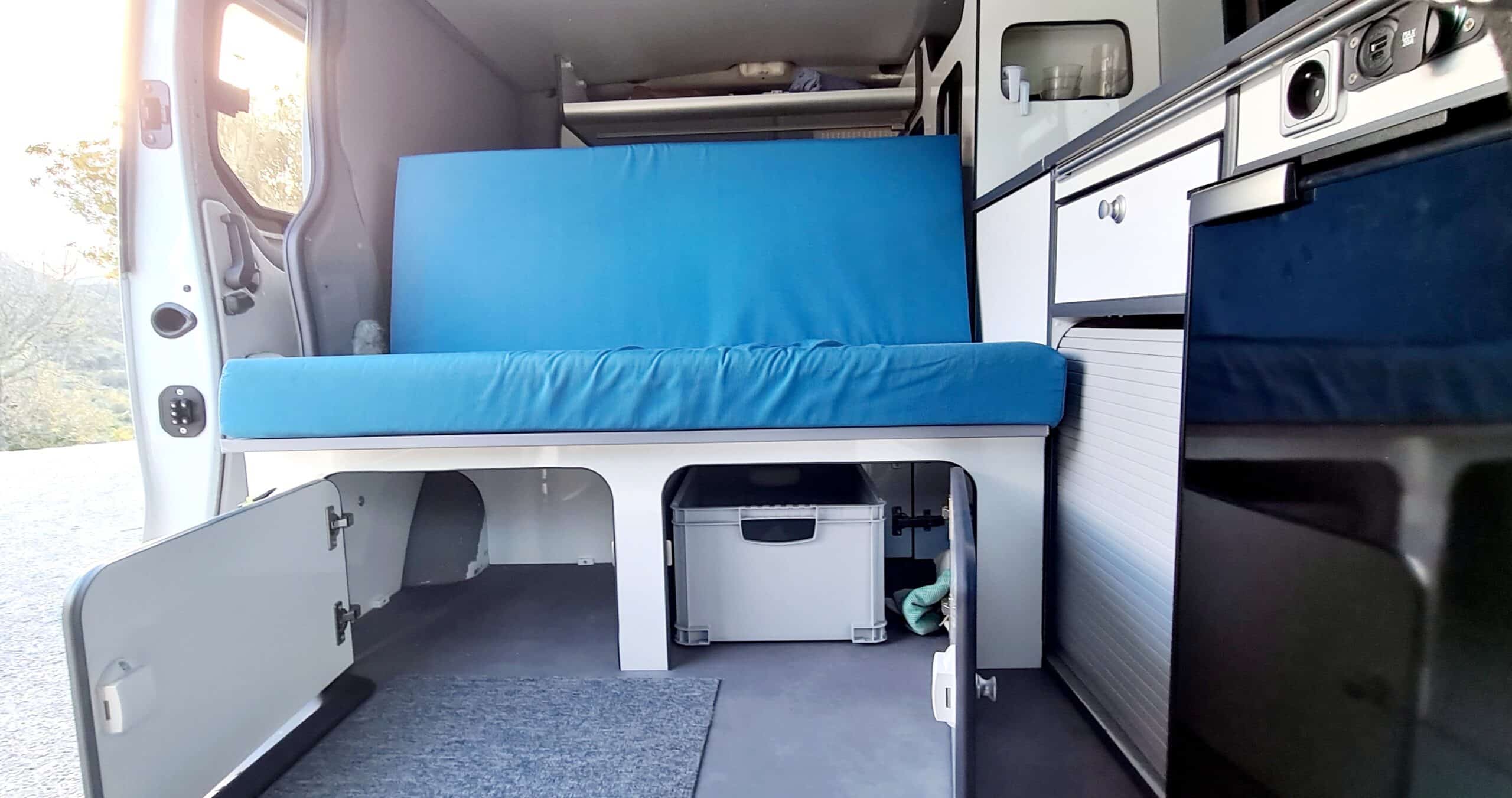 Van équipé style California pour allier le côté pratique (Lit prêt en 2 mn avec tous les placards, frigo, porte latérale... qui restent accessibles),
