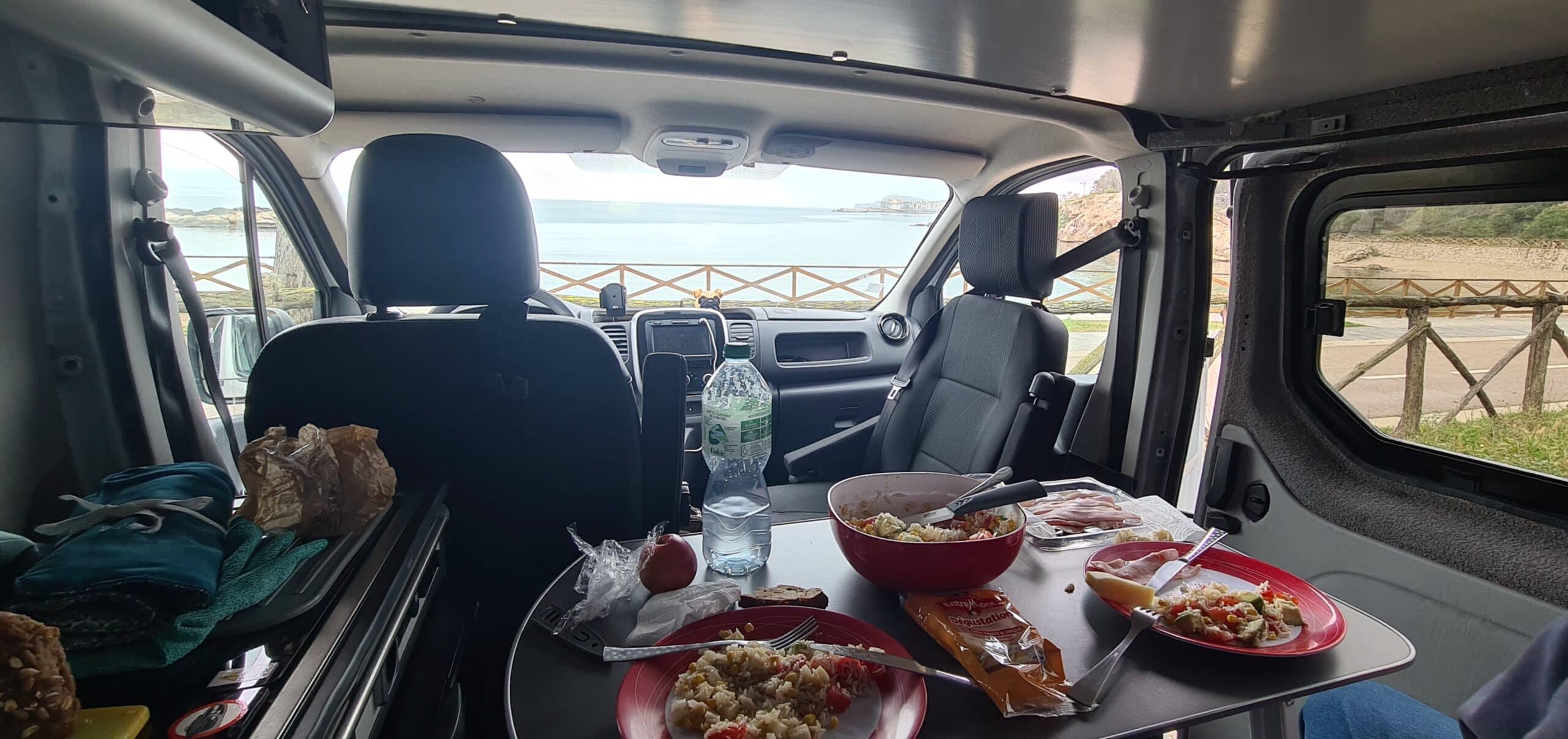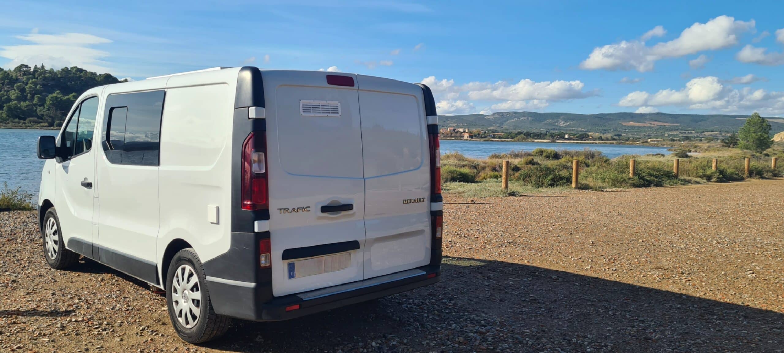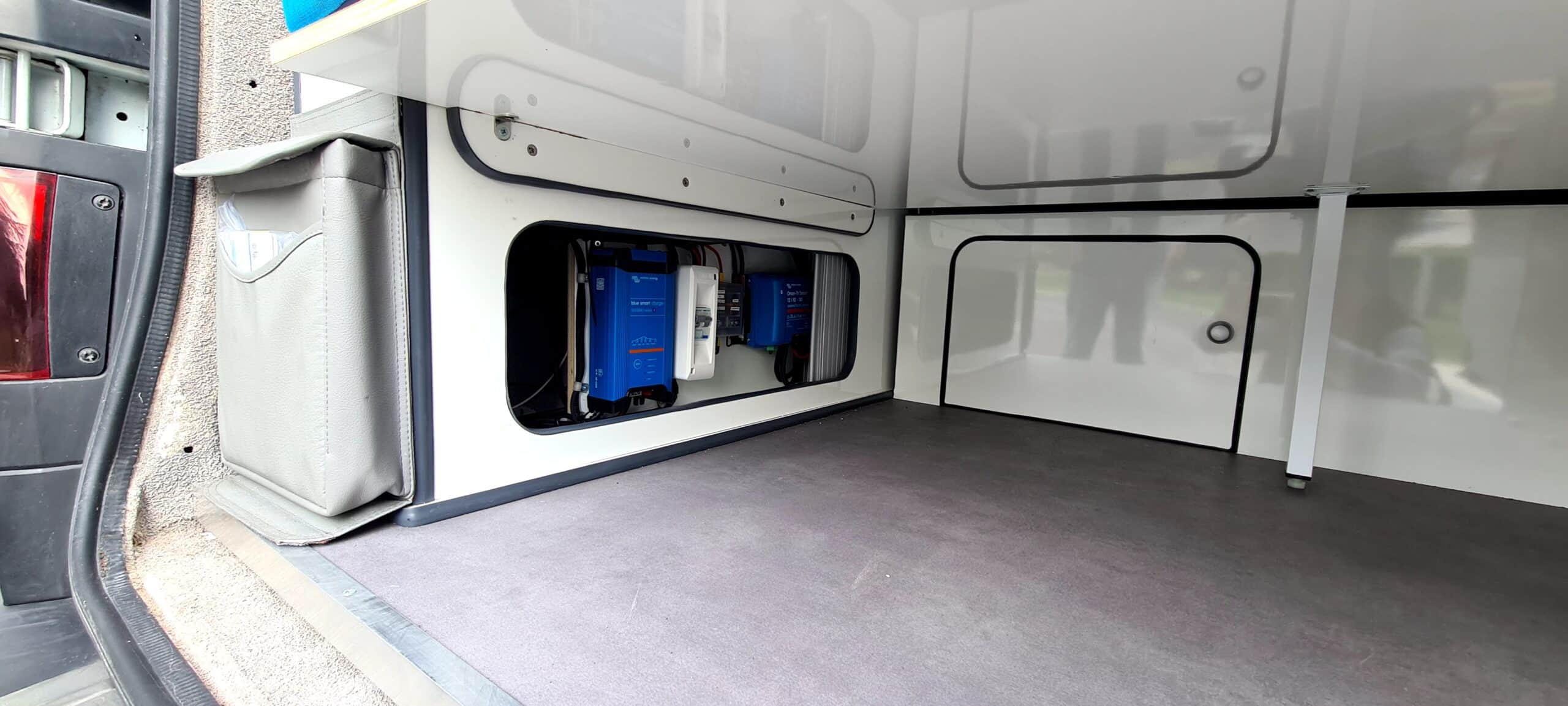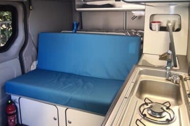 Van équipé style California pour allier le côté pratique (Lit prêt en 2 mn avec tous les placards, frigo, porte latérale... qui restent accessibles),