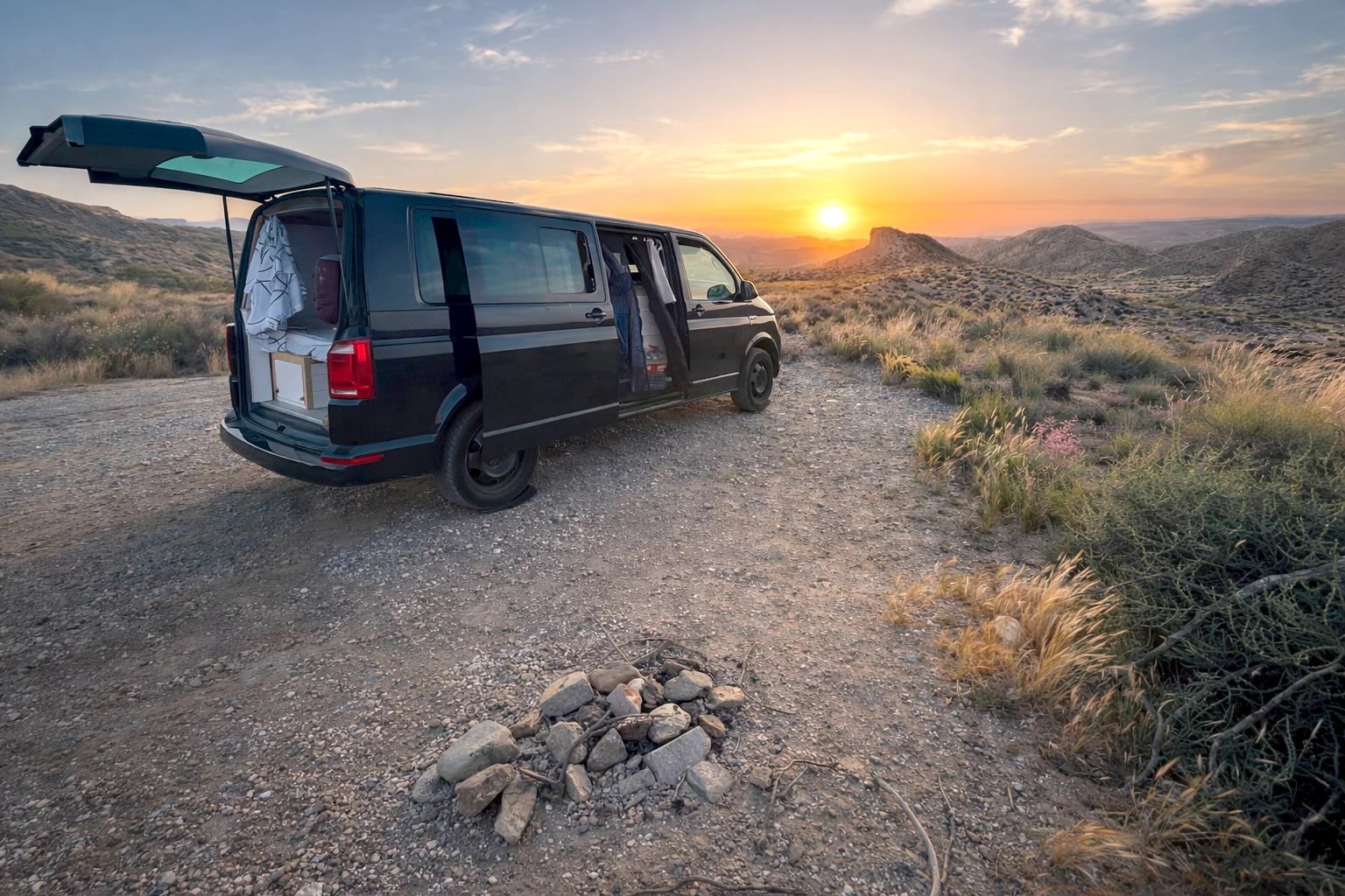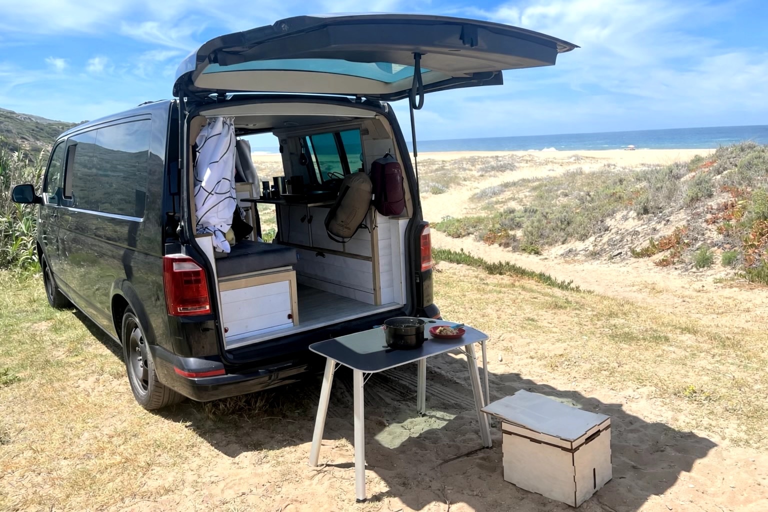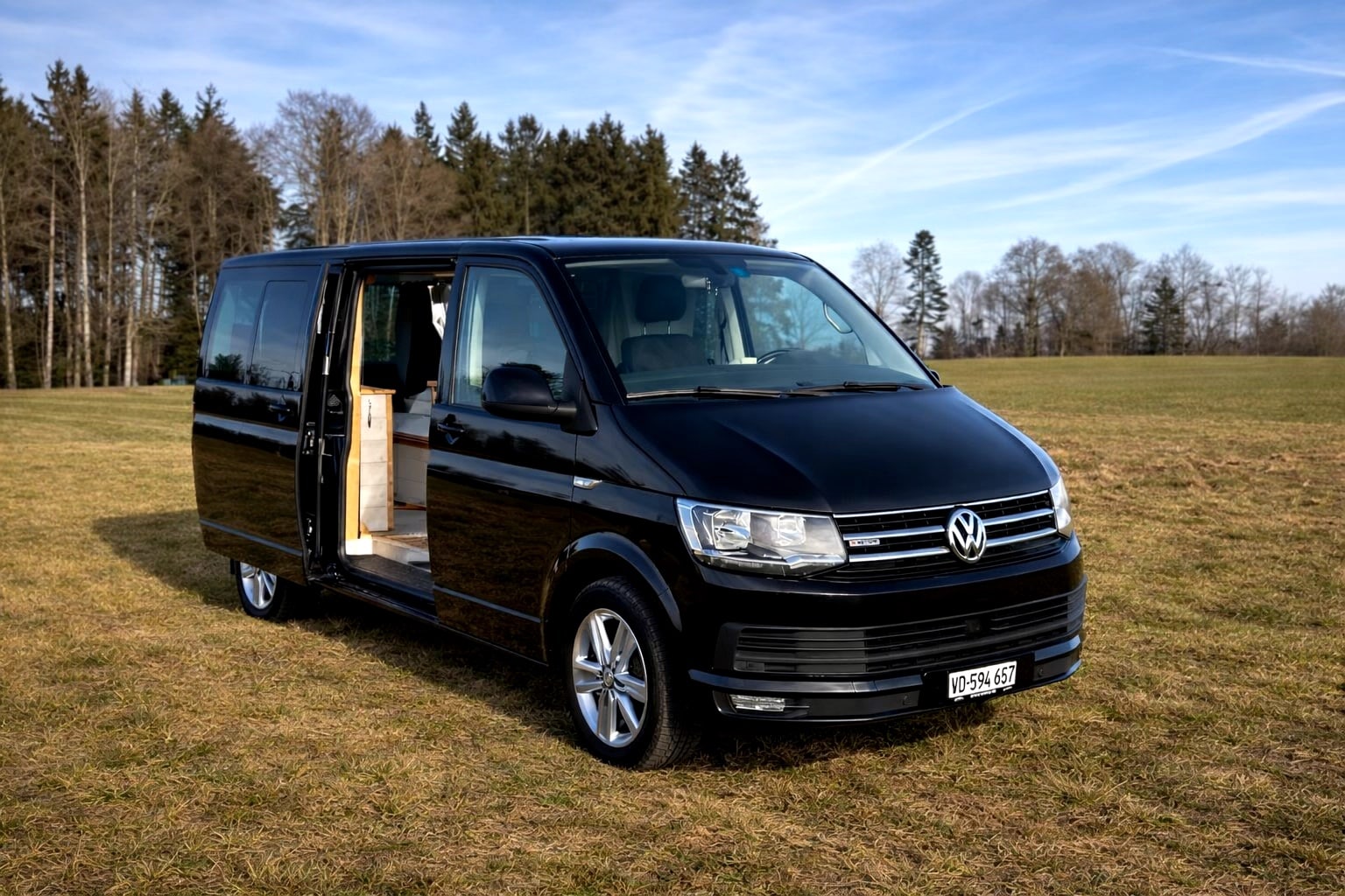 Van Volkswagen noir aménagé en pleine nature