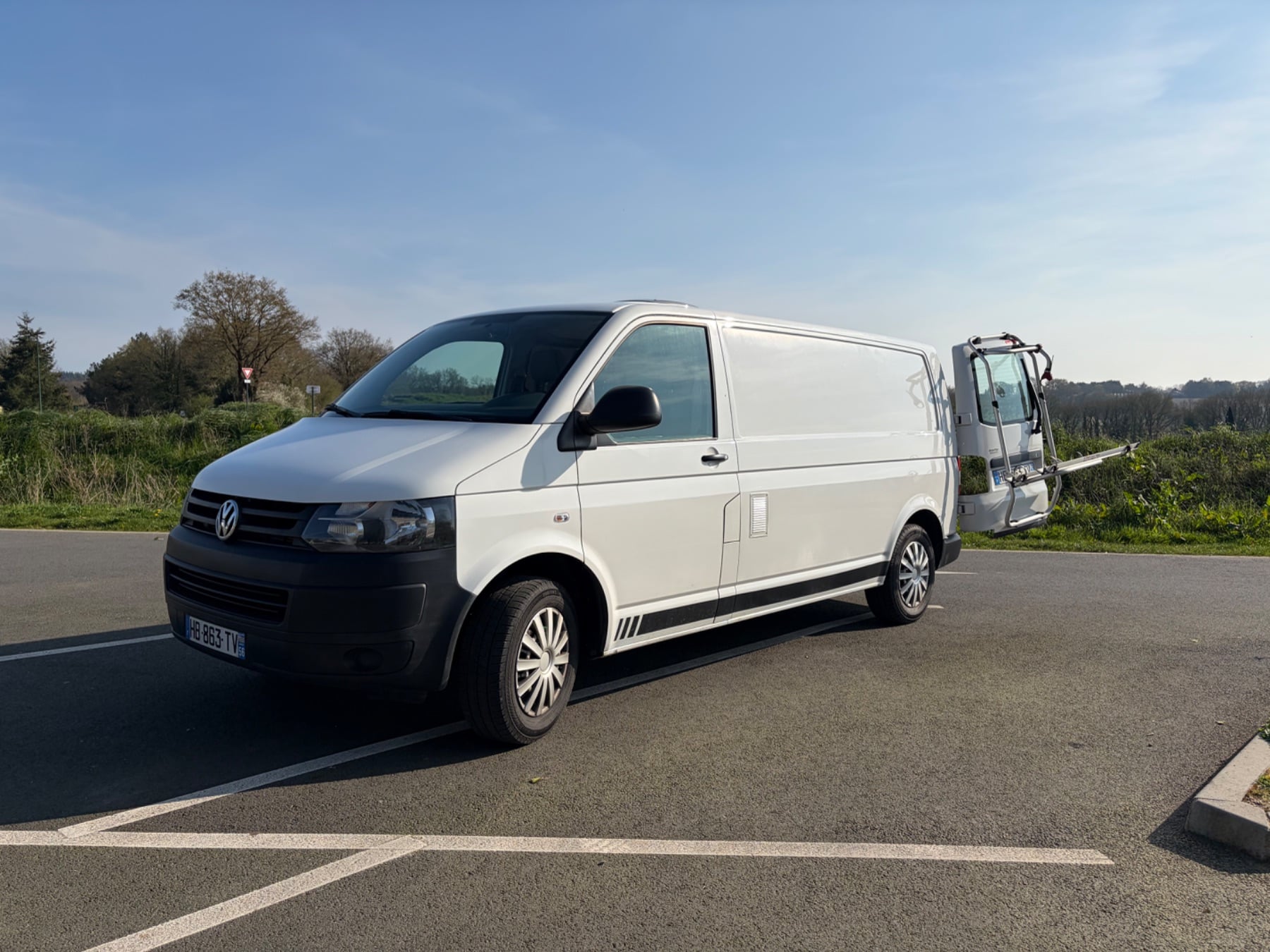 Fourgon Volkswagen blanc avec porte-vélos arrière