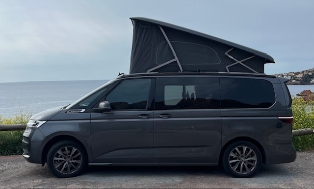 Van aménagé gris avec toit relevable face mer