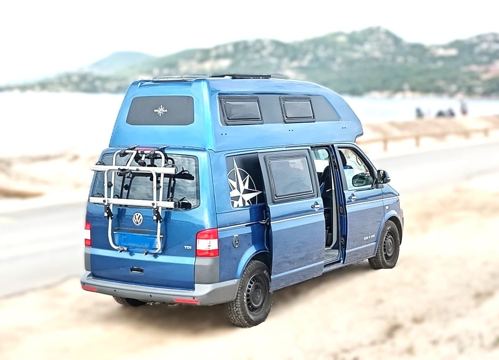 Van aménagé bleu avec toit relevable stationné en extérieur