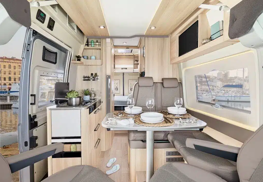 Un fourgon aménagé bien conçu optimise chaque centimètre. Lit escamotable, banquettes convertibles, rangements intégrés, coin cuisine fonctionnel et parfois même salle d’eau compacte : tout est pensé pour offrir un vrai confort de vie dans un espace réduit.