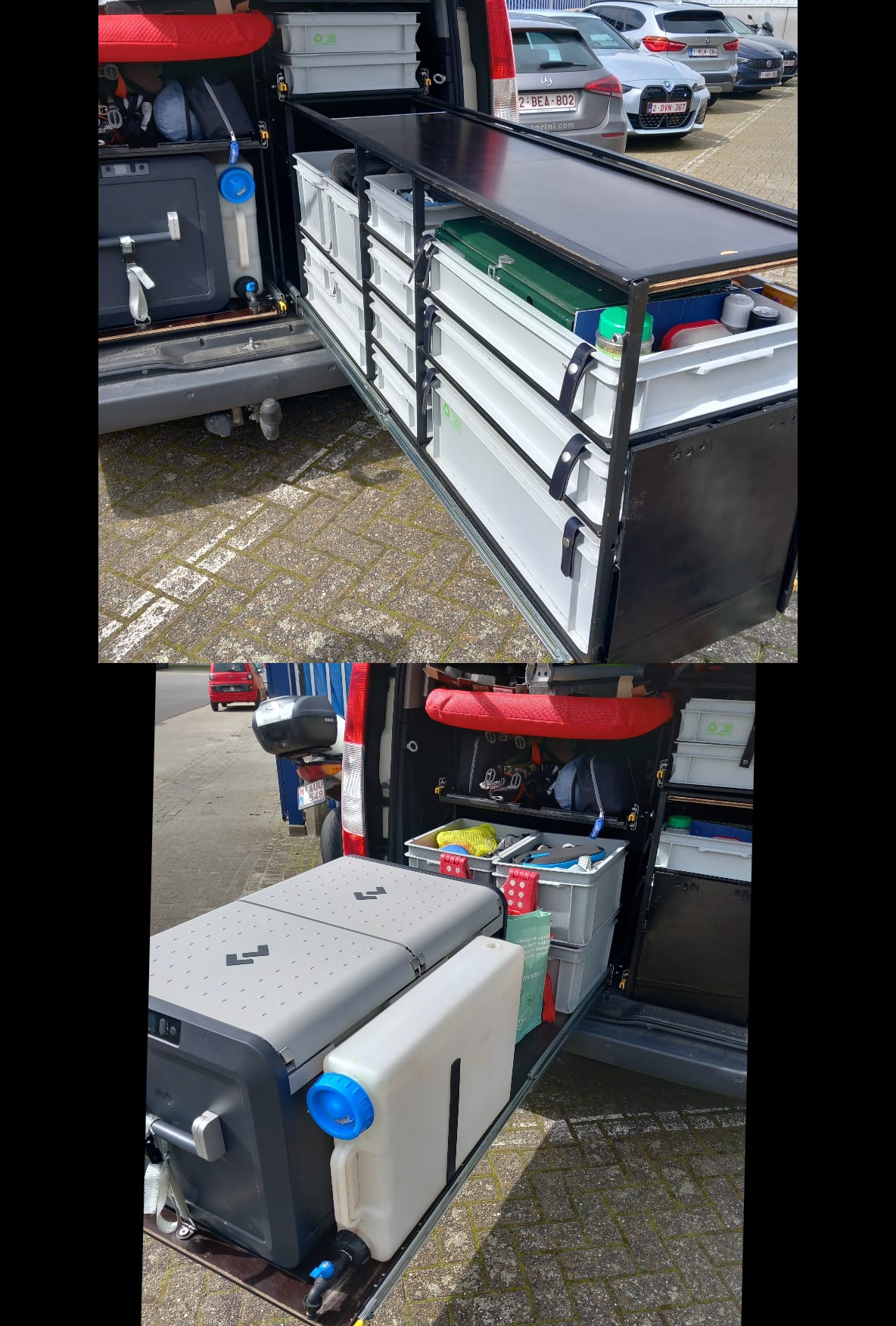 Möbel 1: 2 Module auf Schienen mit stapelbaren Kisten: Küche, Arbeitsfläche, Kleideraufbewahrung.