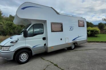 Questo è un Camper con un letto fisso sopra la cabina di guida, noto come "alcova". Questo tipo di veicolo è molto apprezzato dalle famiglie per la sua capacità di offrire più posti letto senza ridurre lo spazio abitativo.